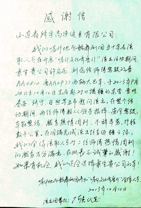 本次包車是受山東省援疆辦委托,接送新疆“喀什文化齊魯行”來訪團成員共計90余人在省內各地匯報巡演。濟宇高速商務中心作為省內唯一供車方,按照供車要求,派出三部豪華客車為來客提供全面優質服務。本次包車從濟南出發,途徑泰安、曲阜、濟寧、東營、濰坊、日照、青島七地,歷經十三天。為順利完成本次活動,全面展現齊魯人民好客尚德的精神面貌,前期,公司專門召開部署會,要求駕駛員統一著裝,佩戴白手套,服務中做到嚴格規范,熱情有禮。活動過程中,車輛準時、設備完好、衛生整潔,給新疆朋友留下了深刻印象,受到了省委組織部的高度贊揚,離開之時,“齊魯行”全體成員還特地請人代筆,留下了漢字版的手寫感謝信。