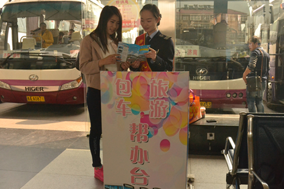 包車旅游幫辦臺,出行服務好幫手。為方便廣大團體旅客特別是來濟轉乘的團體旅客辦理包車、旅游等業務,總站在中轉旅客較為集中的40號檢票口設立了“包車旅游幫辦臺”,為外地來濟的團體旅客提供包車優惠、旅游咨詢的專項服務。僅三天時間,就幫助14個團體旅客群體辦理了包車業務,實現包車收入8000余元。