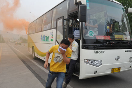 演習(xí)期間,模擬進(jìn)行了車輛運(yùn)行中突然起火后的乘客疏散、逃生、火災(zāi)撲救等科目。自駕駛員發(fā)現(xiàn)起火,到開啟應(yīng)急燈車輛緊急???,打開應(yīng)急逃生門,指揮疏散到全部乘員疏散完畢,整個(gè)過程歷時(shí)3分鐘;隨后,駕駛員利用車載滅火器,對車輛著火部位進(jìn)行了撲救和報(bào)警求救等,所有演練科目歷時(shí)30分鐘。通過本次消防演練活動(dòng),使駕駛員的安全防范意識和滅火能力都有進(jìn)一步的增強(qiáng),對消防安全常識有了進(jìn)一步的了解,對車輛發(fā)生火災(zāi)事故時(shí)的自救能力、逃生能力都得到了一定的提高。
